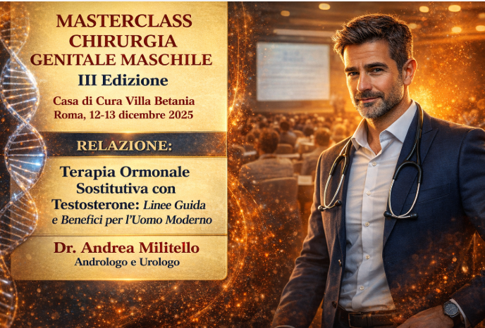 All’interno di questo contesto scientifico di alto profilo, il Dr. Andrea Militello ha contribuito in modo significativo al dibattito sulla terapia ormonale sostitutiva con testosterone (TRT), con particolare attenzione alla distinzione tra ormoni bioidentici e non bioidentici, tema oggi centrale nella gestione clinica dell’uomo adulto e dell’uomo in aging.